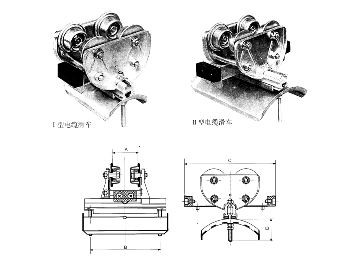 工字鋼電纜滑車裝置由首車、電纜滑車、固定車(末車)組成。其規(guī)格分為I型和II型,I型電纜滑車裝置適用于10#工字鋼;II型適用于10#-28#工字鋼,安裝時(shí)加以調(diào)整。