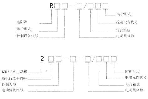 | 交流起重機JZR2系列電動機成套電阻器 本系列成套電阻器主要用作交流起重機控設備的JZR2及JZRH2系列繞線式異電動機的啟動、制動與調速電阻 一、型號含義 A)企業型號